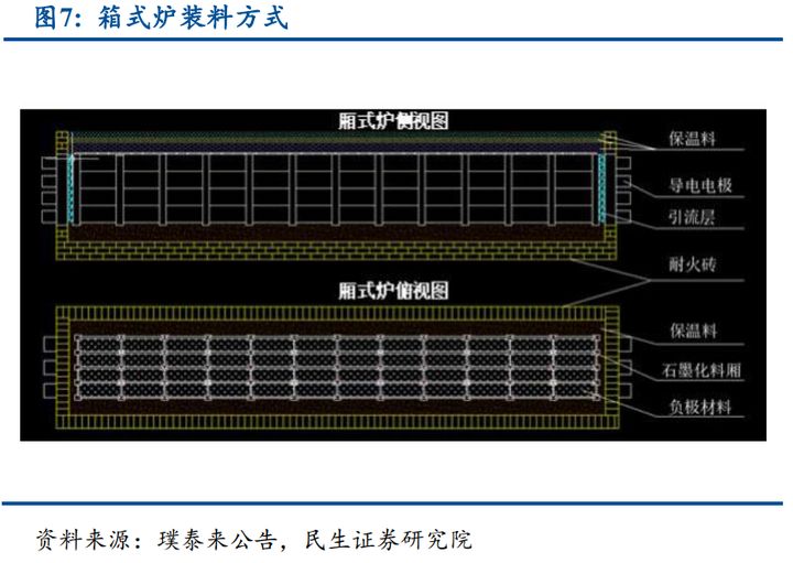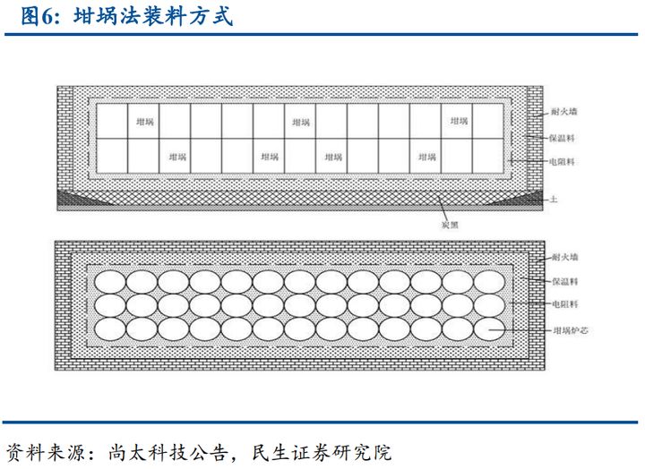 廂式裝爐法:相比坩堝法而言減少了生產(chǎn)輔料,耗電量下降、成本降低,生產(chǎn)效率提升,但容量、首效和石墨化程度略遜于坩堝裝爐法。