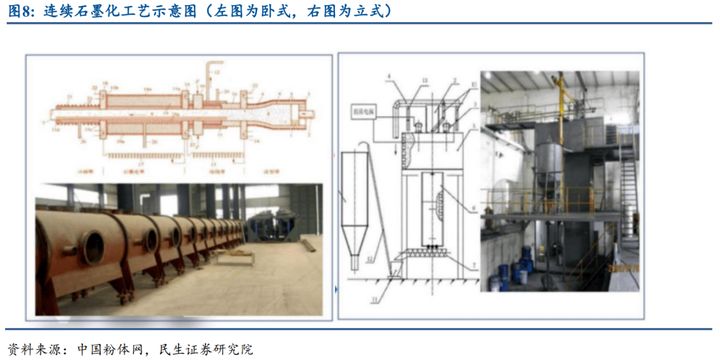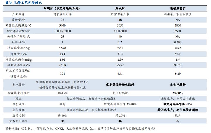 連續(xù)法:耗電最少,無生產(chǎn)輔料,連續(xù)生產(chǎn)下的成本大幅降低、能量利用率較高,環(huán)保,一致性好,但容量、首效和石墨化程度較低,可應(yīng)用于中低端產(chǎn)品,若產(chǎn)品品質(zhì)能得以提高,則有望成為未來的方向。