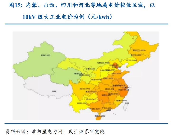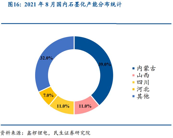 從地域上看,國內(nèi)負(fù)極石墨化產(chǎn)能主要位于電價較低地區(qū),其中近 40%集中在內(nèi)蒙古地區(qū),在山西、四川、河北等地也有分布。以 2021 年 10kV 級大工業(yè)電價為例(元/kwh),內(nèi)蒙古、山西、四川和河北的電價分別為 0.4489、0.5082、0.5774、0.5481 元/kWh,在交通便利的中東部屬電價較低區(qū)域。
