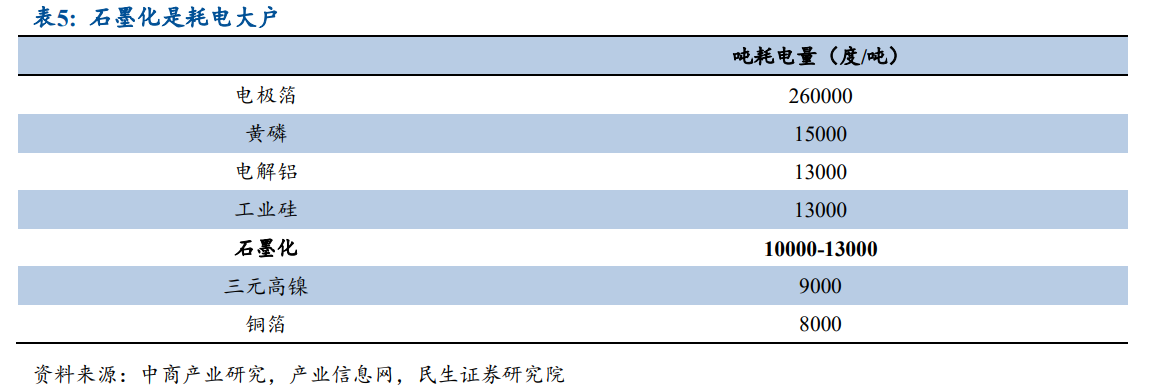 石墨化在中游材料中屬于耗能大戶,將受到重點關(guān)注。以最常用的艾奇遜法為例,單噸耗電量為 1-1.2 萬度,高于高耗能的三元正極和銅箔。
