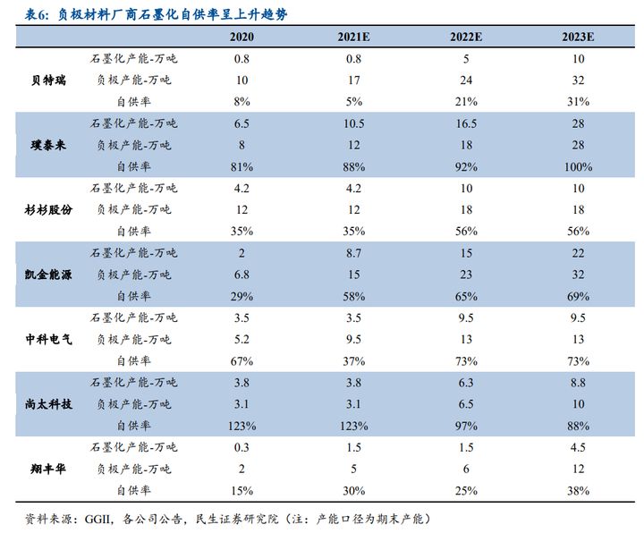 負(fù)極廠商一體化擴(kuò)產(chǎn),增加供給。從各廠商公告的一體化產(chǎn)能規(guī)劃來看,石墨化自供率逐年呈上升趨勢,根據(jù)我們估計,專注于人造石墨的企業(yè) 2023 年目標(biāo)將實現(xiàn)自供率 70%以上。但審批成功率和進(jìn)度邊際收緊,石墨化長期供應(yīng)增長將有限。