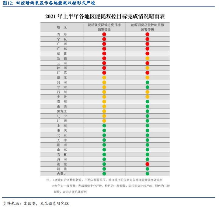 2021 年 8 月,發(fā)改委發(fā)布《2021 年上半年各地區(qū)能耗雙控目標(biāo)完成情況晴雨表》,與 20Q1-3相比,各省能耗目標(biāo)完成情況在 2021 年顯著較差。青海、寧夏、廣東、廣西、福建等 19 個地區(qū)能耗強(qiáng)度不降反升;另外亦有 13 個地區(qū)能耗總量控制目標(biāo)處于一、二級預(yù)警。